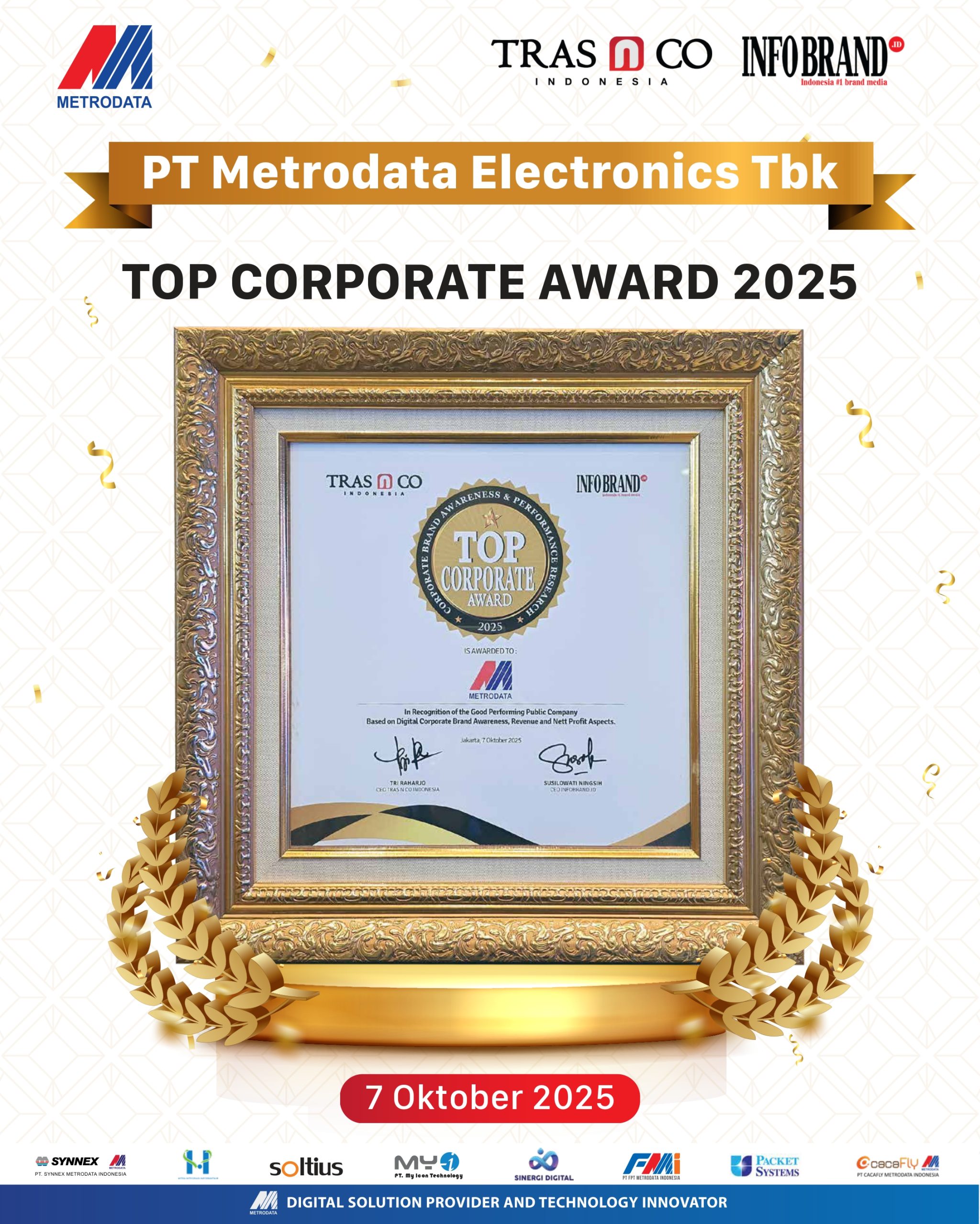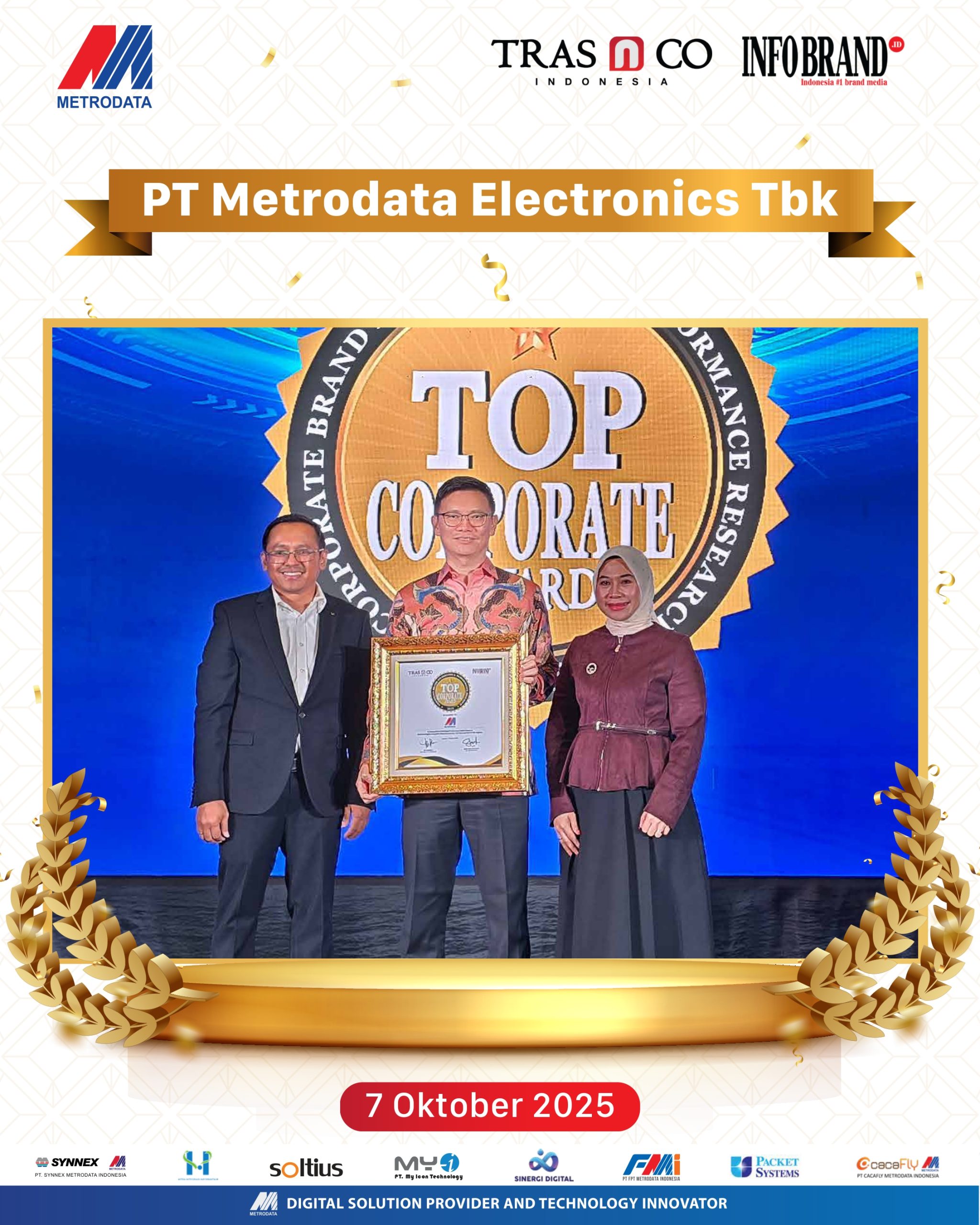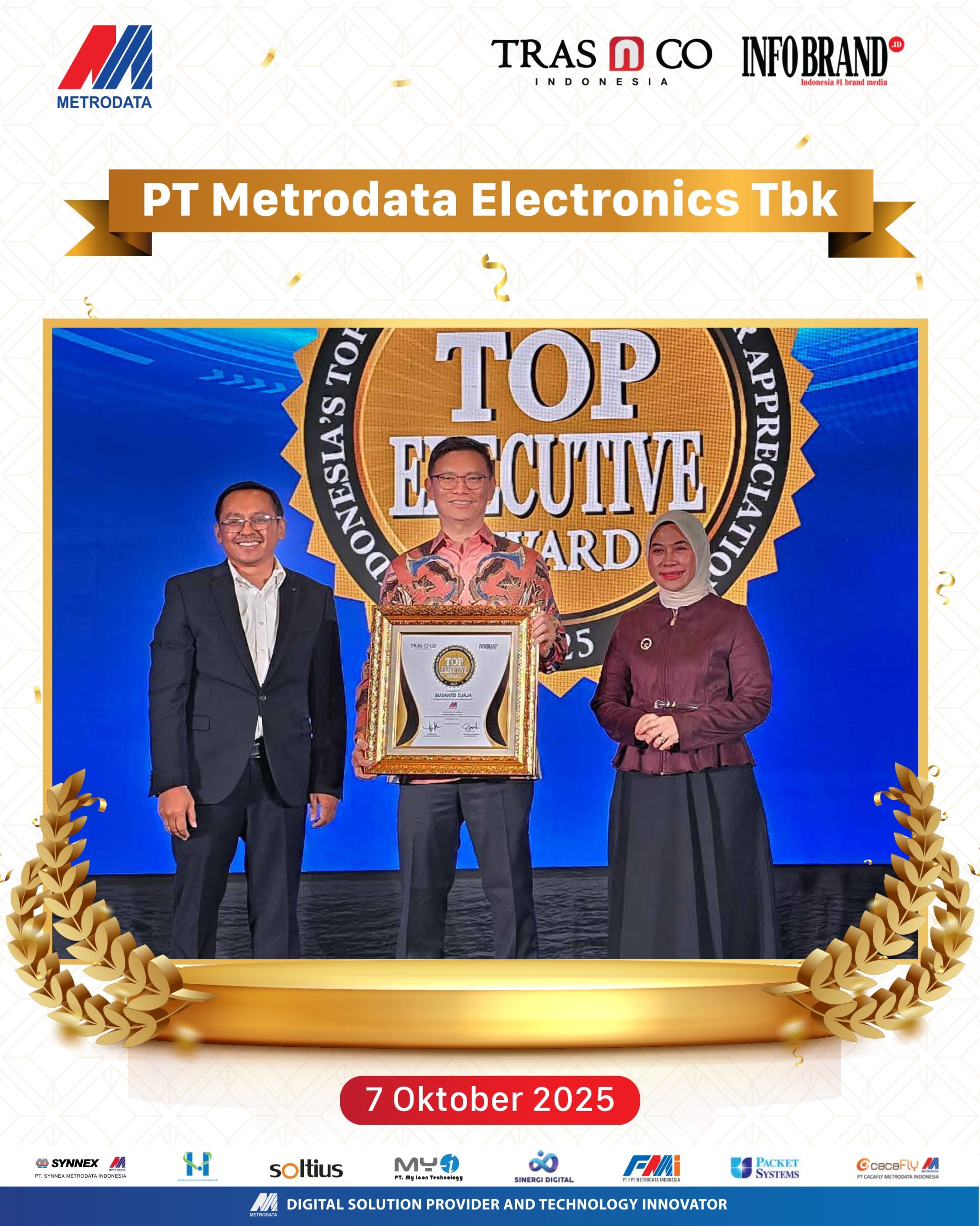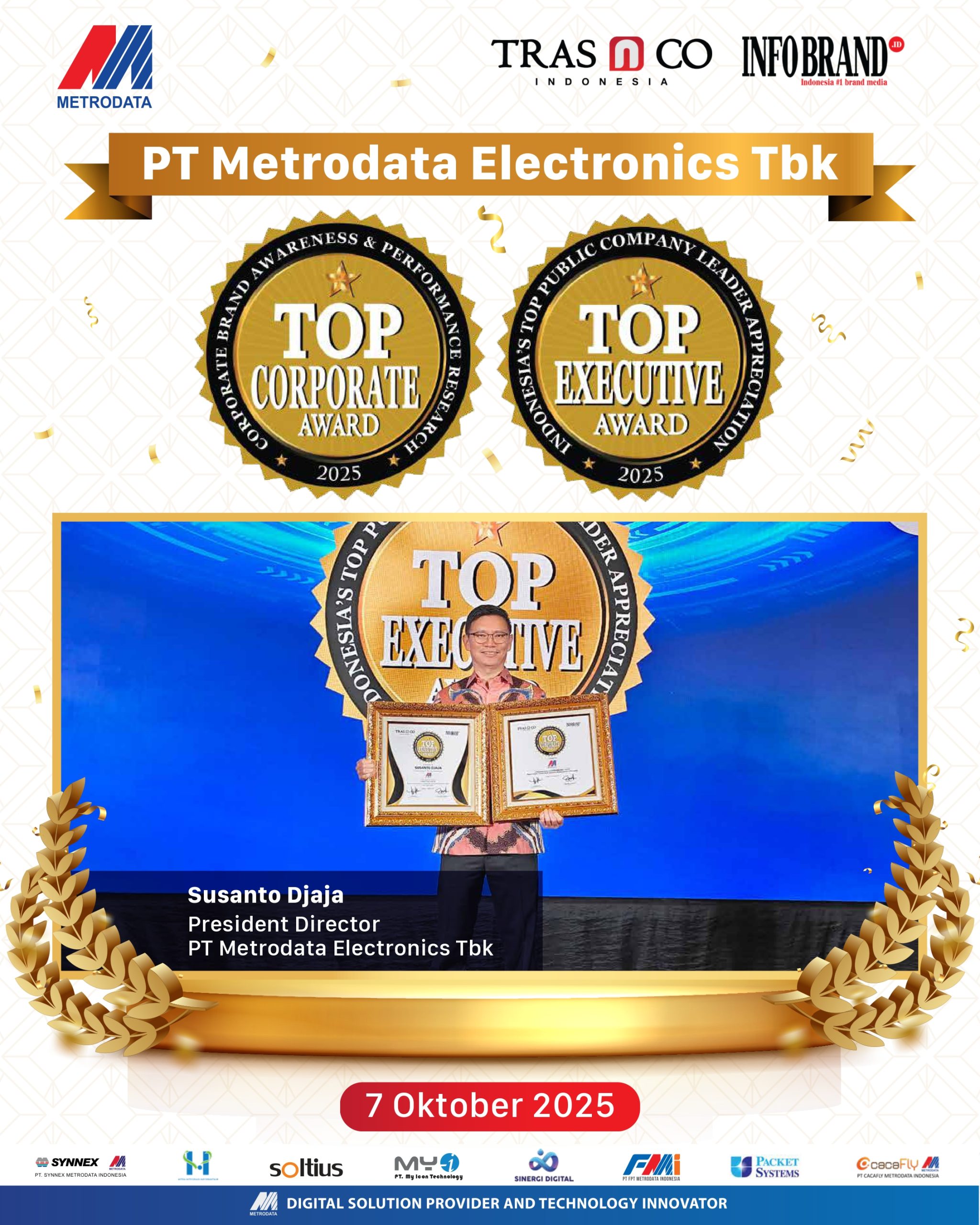 Jakarta, 2025 — PT Metrodata Electronics Tbk (Metrodata) kembali menorehkan prestasi gemilang dengan berhasil meraih dua penghargaan bergengsi, yaitu TOP CORPORATE AWARD 2025 dan TOP EXECUTIVE AWARD 2025.