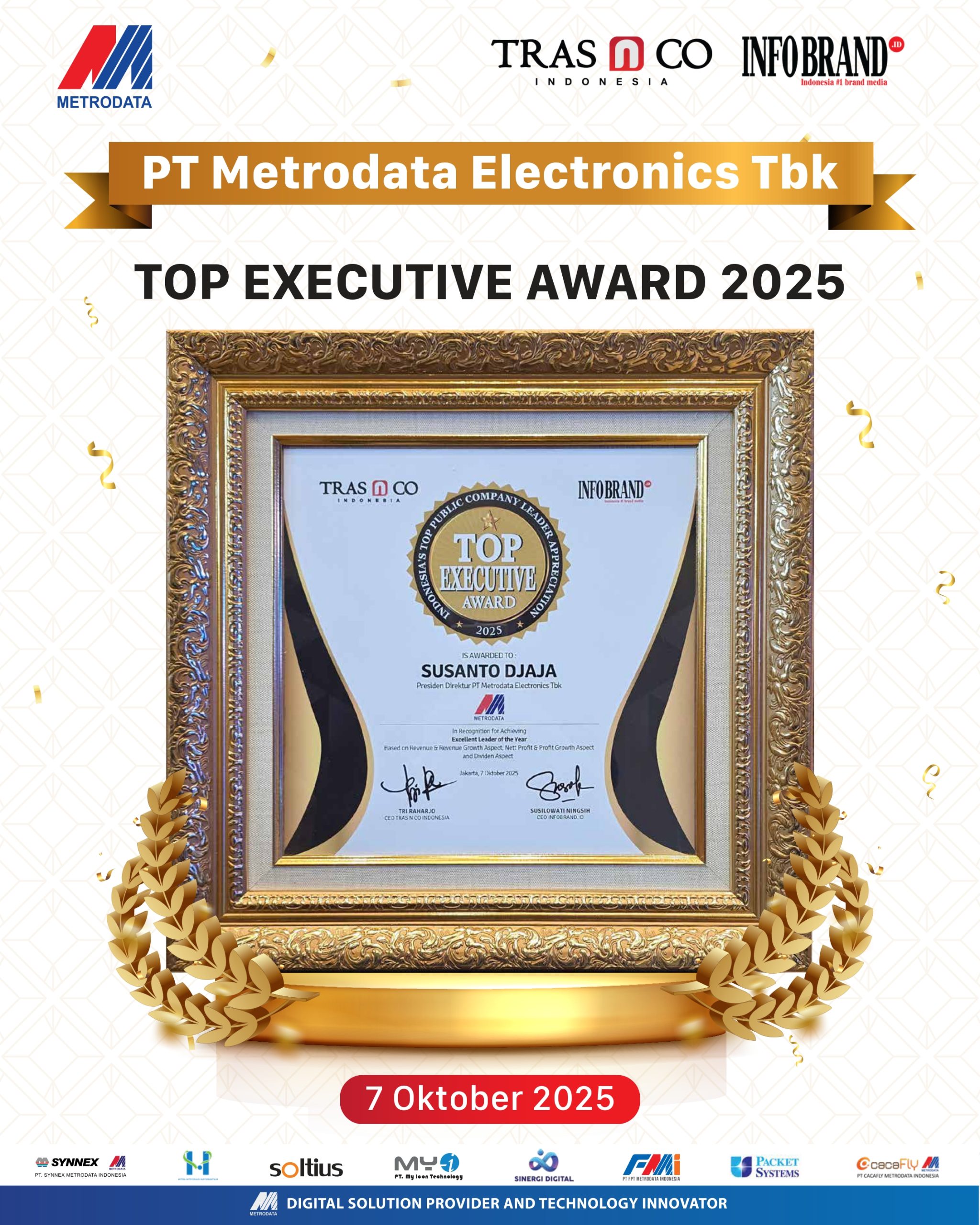 Penghargaan ini diberikan sebagai bentuk apresiasi atas konsistensi Metrodata dalam menunjukkan kinerja unggul, inovasi berkelanjutan, serta kontribusinya terhadap perkembangan industri teknologi informasi di Indonesia.